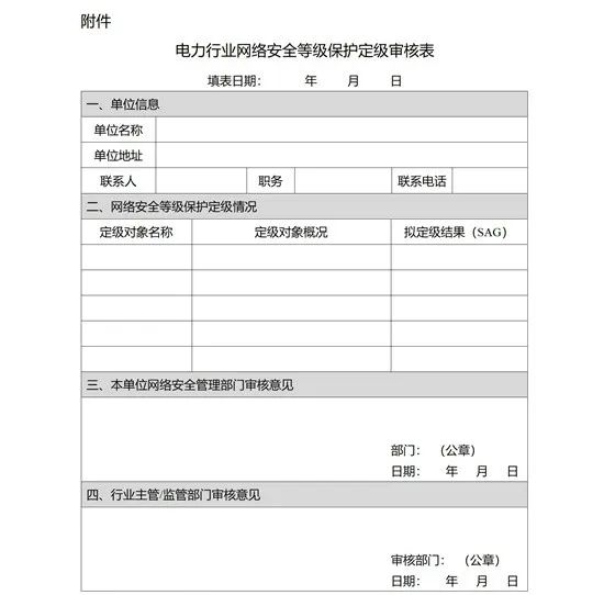 第九條 電力企業(yè)辦理網(wǎng)絡(luò)安全等級(jí)保護(hù)定級(jí)審核手續(xù)時(shí),應(yīng)當(dāng)提交《電力行業(yè)網(wǎng)絡(luò)安全等級(jí)保護(hù)定級(jí)審核表》(詳見附件),含各定級(jí)對(duì)象的定級(jí)報(bào)告及專家評(píng)審意見。