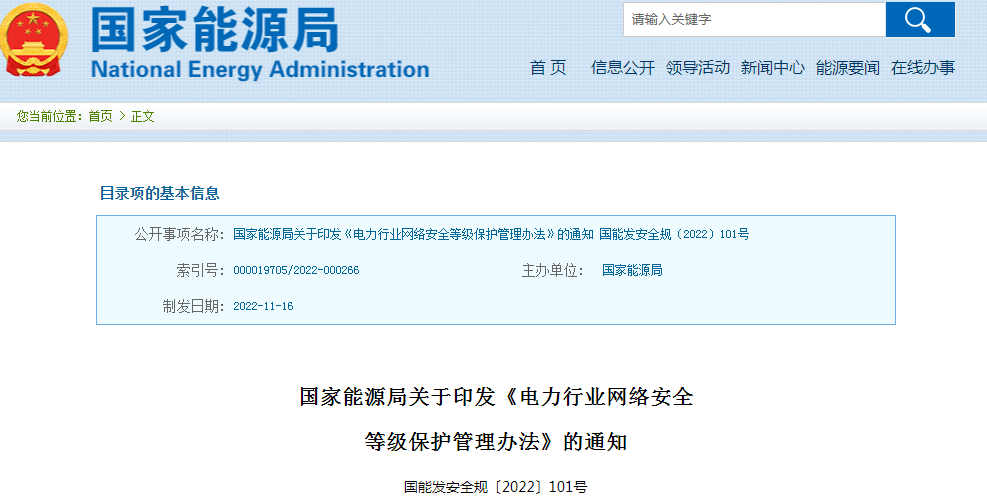 國(guó)家能源局發(fā)布《電力行業(yè)網(wǎng)絡(luò)安全等級(jí)保護(hù)管理辦法》