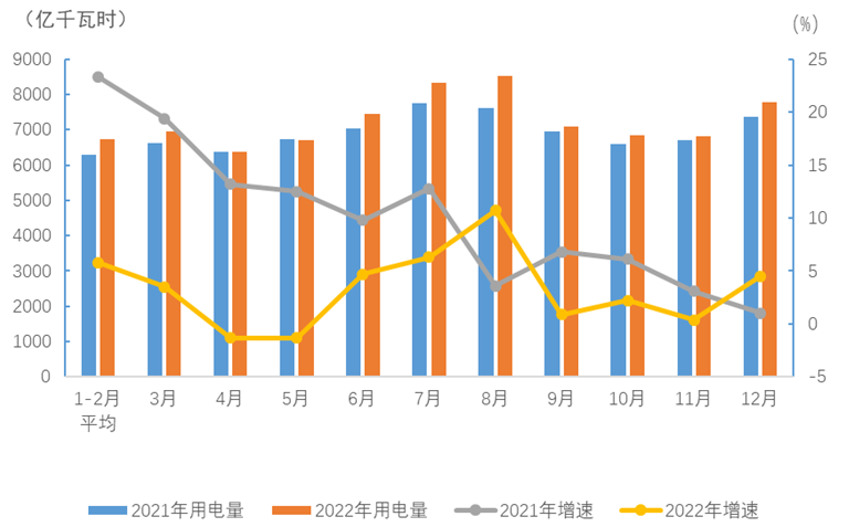 圖1 2021、2022年分月全社會(huì)用電量及其增速