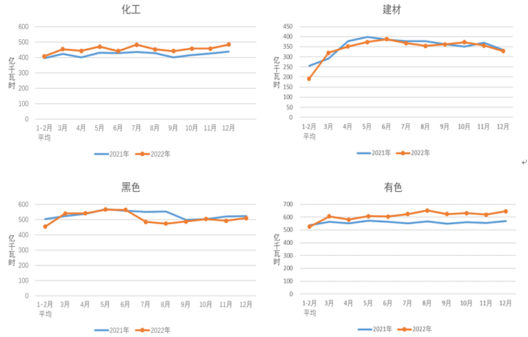 圖2 2021、2022年重點(diǎn)行業(yè)分月用電量情況