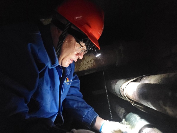 狹窄的通道內(nèi),張軍半躬著身體曲腿前行,一邊聽(tīng)著呲水聲一邊摸索著前進(jìn),在離井口5米處找到了正在不斷呲水的漏點(diǎn)。他蹲在漏點(diǎn)旁,嘴中含著手電筒,將管卡覆蓋漏點(diǎn),顧不得強(qiáng)烈的水流順著管卡噴濺到身上。由于八道螺絲需要均勻受力反復(fù)緊扣,在不足半米的空間內(nèi),他使出渾身力氣擰著螺絲。當(dāng)泄漏封堵完成,張軍從井里爬出來(lái)時(shí),渾身都已被水呲透。