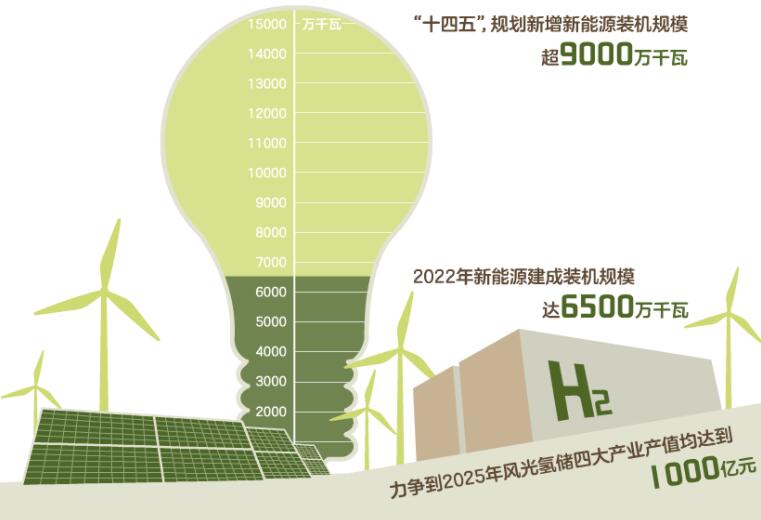 2022年,內(nèi)蒙古新能源建成裝機(jī)規(guī)模達(dá)到6500萬千瓦,連續(xù)兩年成為全國唯一一個風(fēng)電光伏發(fā)電量超過1000億千瓦時的省區(qū)。“十四五”期間,內(nèi)蒙古規(guī)劃新增超過9000萬千瓦的新能源裝機(jī)規(guī)模,力爭到2025年風(fēng)光氫儲四大產(chǎn)業(yè)產(chǎn)值均達(dá)到1000億元。