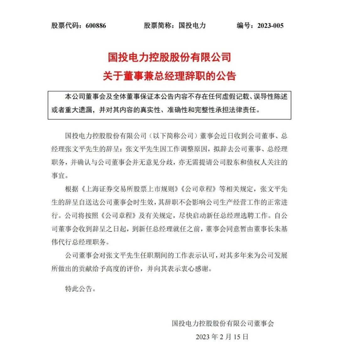 2月15日,國投電力發(fā)布關(guān)于董事兼總經(jīng)理辭職的公告。公告顯示,董事會近日收到公司董事、總經(jīng)理張文平先生的辭呈,張文平因工作調(diào)整原因,擬辭去公司董事、總經(jīng)理職務(wù),并確認與公司董事會并無意見分歧,亦無需提請公司股東和債權(quán)人關(guān)注的事宜。