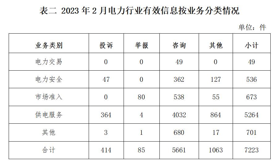 電力行業(yè)排在首位,有效信息數(shù)量為7223件,占全部有效信息的70.37%。群眾關(guān)注的內(nèi)容主要集中在供電服務(wù)、電力安全、成本價(jià)格和收費(fèi)等方面。(2023年2月電力行業(yè)有效信息按業(yè)務(wù)分類情況見表二)