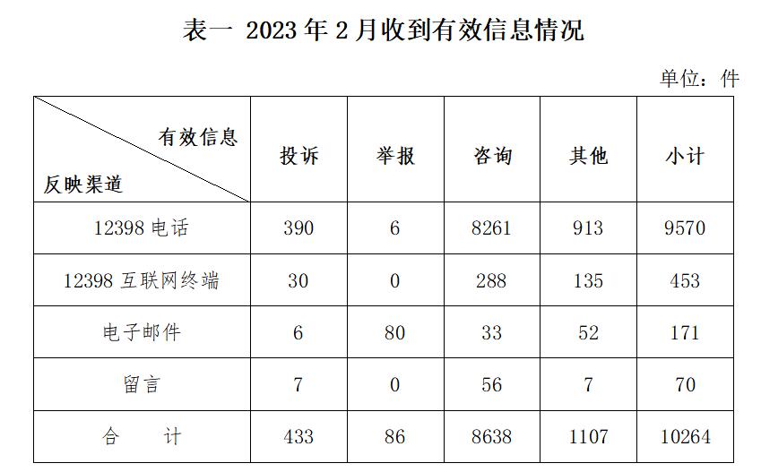 2023年2月,國家能源局12398能源監(jiān)管熱線(以下簡(jiǎn)稱12398熱線)共收到有效信息10264件(包含投訴、舉報(bào)、咨詢和其他訴求類別),環(huán)比減少27.07%,同比增加22.69%。(2023年2月收到有效信息情況見表一)