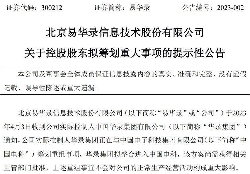 4月3日,北京易華錄信息技術(shù)股份有限公司發(fā)布公告稱,收到公司實際控制人中國華錄集團有限公司(以下簡稱“華錄集團”)通知,華錄集團正在與中國電子科技集團有限公司(以下簡稱“中國電科”)籌劃重組事項,華錄集團擬整合進入中國電科。易華錄表示,該方案尚需獲得相關(guān)主管部門批準,上述重組事宜不會對公司的正常生產(chǎn)經(jīng)營活動構(gòu)成重大影響。公司將按照法律法規(guī)的要求及時披露進展情況。