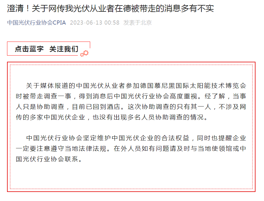 據(jù)“中國光伏行業(yè)協(xié)會CPIA”微信公眾號13日消息,關(guān)于媒體報(bào)道的中國光伏從業(yè)者參加德國慕尼黑國際太陽能技術(shù)博覽會時被帶走調(diào)查一事,得到消息后中國光伏行業(yè)協(xié)會高度重視。經(jīng)了解,當(dāng)事人只是協(xié)助調(diào)查,目前已回到酒店。這次協(xié)助調(diào)查的只有其一人,不涉及網(wǎng)傳的多家中國光伏企業(yè),也沒有出現(xiàn)多名人員協(xié)助調(diào)查的情況。