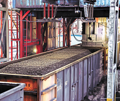 裝煤 陜西省榆林市 國家能源集團(tuán)神東煤炭洗選中心大柳塔環(huán)線裝車車間裝煤現(xiàn)場。