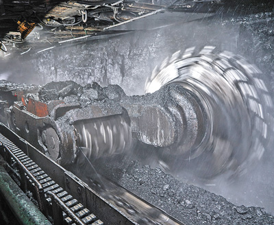 開采 內(nèi)蒙古自治區(qū)鄂爾多斯市 布爾臺煤礦綜采工作面,機(jī)器在開足馬力生產(chǎn)。