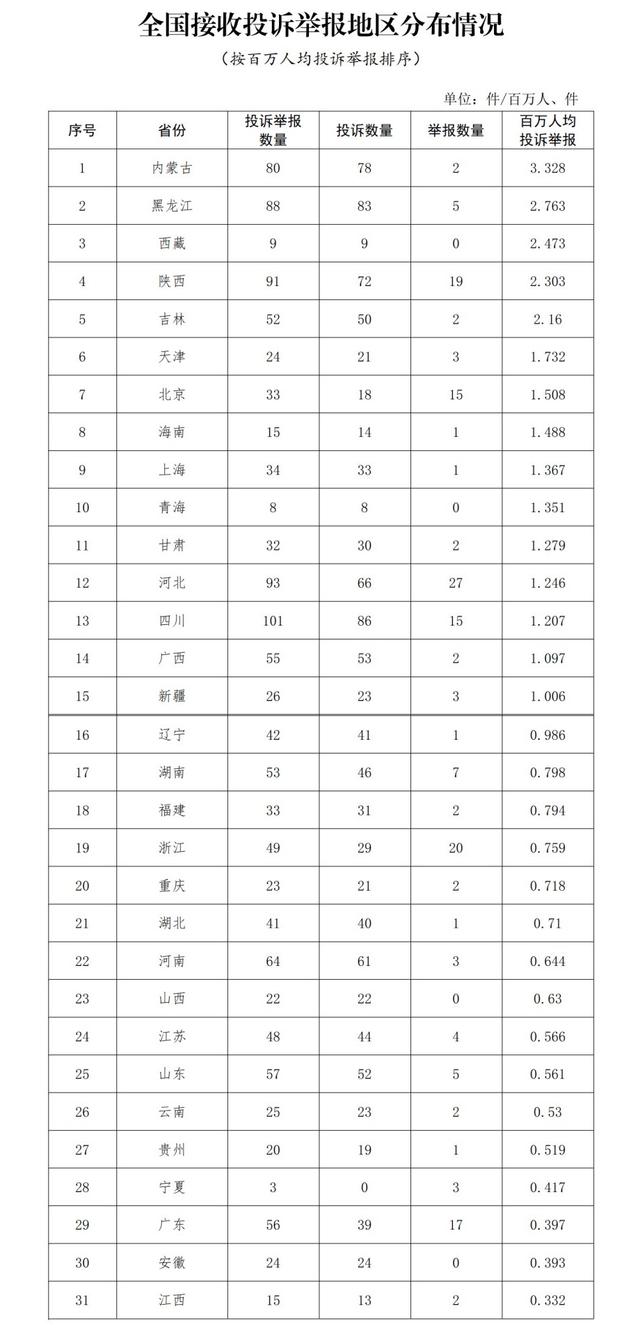 各省(自治區(qū)、直轄市)按照接收投訴舉報數(shù)量排序,四川、河北、陜西、黑龍江、內(nèi)蒙古排在全國前5位。其中:按投訴數(shù)量排序,四川、黑龍江、內(nèi)蒙古、陜西、河北排在全國前5位;按舉報數(shù)量排序,河北、浙江、陜西、廣東、北京(四川并列)排在全國前5位;按百萬人均投訴舉報數(shù)量排序,內(nèi)蒙古、黑龍江、西藏、陜西、吉林排在全國前5位。(全國接收投訴舉報地區(qū)分布情況詳見附件1)