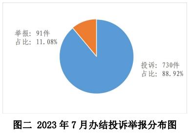 2023年7月,12398熱線共接收投訴舉報1316件,環(huán)比增長39.70%、同比下降27.01%。其中:投訴1149件,環(huán)比增長41.85%、同比下降33.66%;舉報167件,環(huán)比增長26.52%、同比增長135.21%。