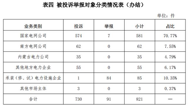 從被投訴舉報對象看,供電企業(yè)733件、占投訴舉報總數(shù)的89.28%,其中國家電網(wǎng)公司581件、占比70.77%,南方電網(wǎng)公司62件、占比7.55%,內(nèi)蒙古電力公司35件、占比3.65%,其他地方電力企業(yè)55件、占比6.17%;承裝(修、試)電力設(shè)施企業(yè)85件、占比10.35%;其他市場主體3件、占比0.37%。