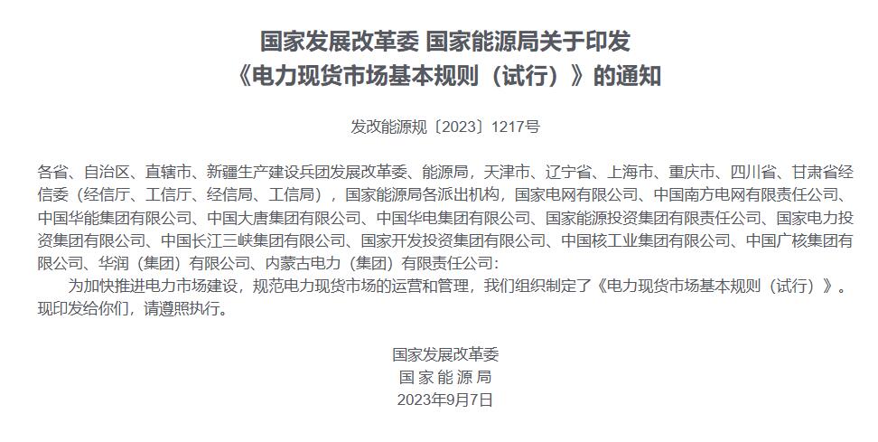 國家發(fā)展改革委 國家能源局關(guān)于印發(fā)《電力現(xiàn)貨市場基本規(guī)則(試行)》的通知