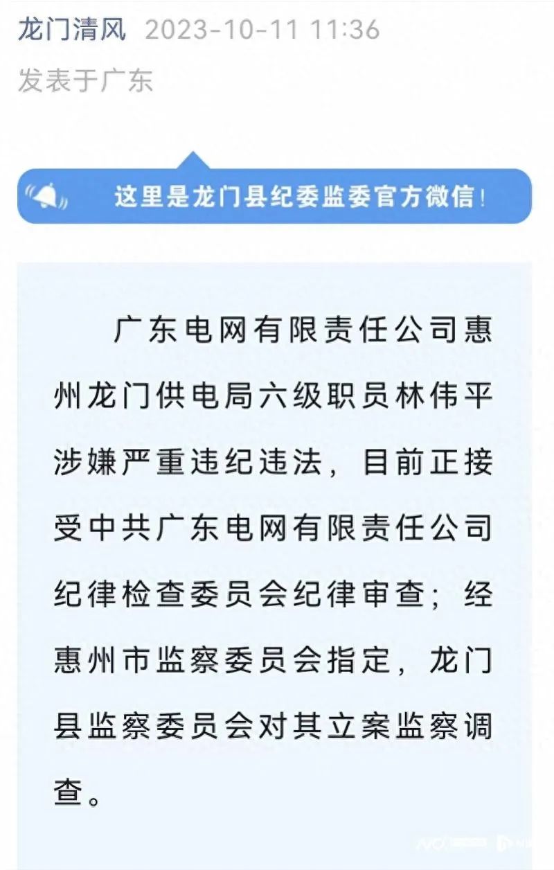 廣東電網(wǎng)有限責(zé)任公司惠州龍門供電局六級職員林偉平涉嫌嚴(yán)重違紀(jì)違法,目前正接受中共廣東電網(wǎng)有限責(zé)任公司紀(jì)律檢查委員會紀(jì)律審查,經(jīng)惠州市監(jiān)察委員會指定,龍門縣監(jiān)察委員會對其立案監(jiān)察調(diào)查。