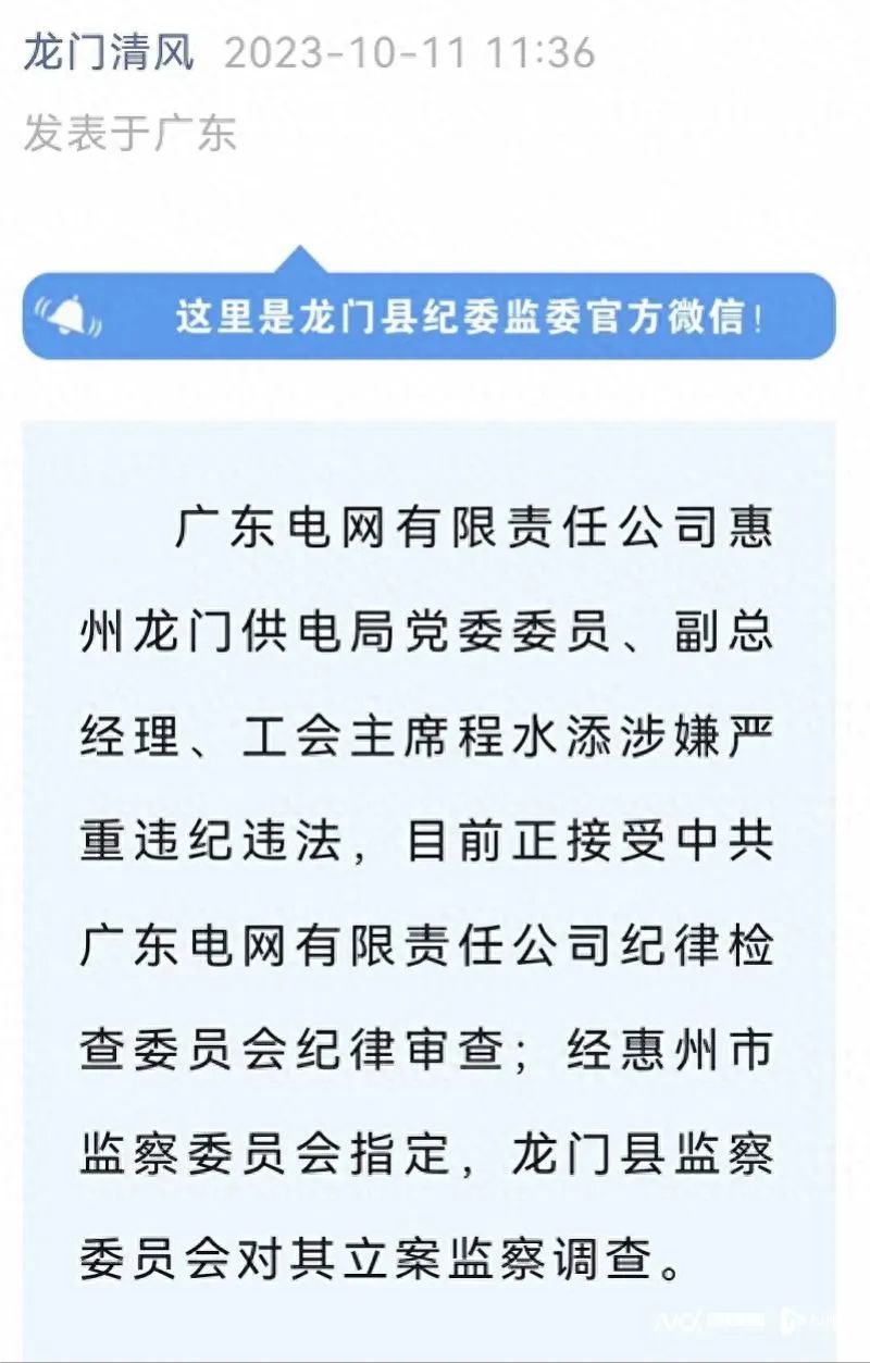 廣東電網(wǎng)有限責(zé)任公司惠州龍門供電局黨委委員、副總經(jīng)理、工會主席程水添涉嫌嚴(yán)重違紀(jì)違法,目前正接受中共廣東電網(wǎng)有限責(zé)任公司紀(jì)律檢查委員會紀(jì)律審查,經(jīng)惠州市監(jiān)察委員會指定,龍門縣監(jiān)察委員會對其立案監(jiān)察調(diào)查。
