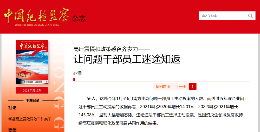 最新一期《中國紀(jì)檢監(jiān)察》雜志刊發(fā)了《高壓震懾和政策感召齊發(fā)力—— 讓問題干部員工迷途知返》一文,文中透露,今年1月至6月,南方電網(wǎng)共有56名問題干部員工主動“投案”。