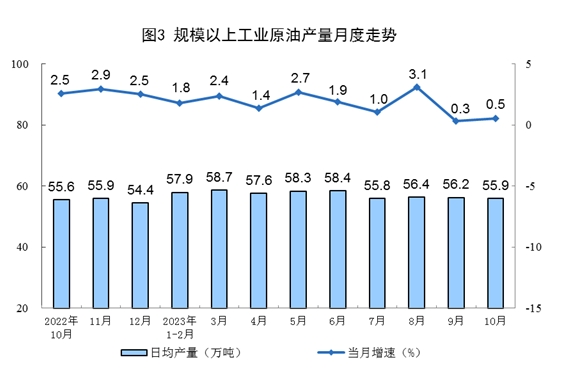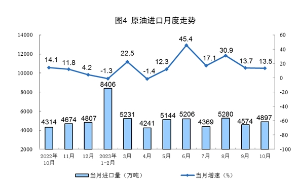 原油生產增速略有加快,進口保持較快增長。10月份,生產原油1733萬噸,同比增長0.5%,增速比9月份加快0.2個百分點,日均產量55.9萬噸。進口原油4897萬噸,同比增長13.5%,增速比9月份放緩0.2個百分點。