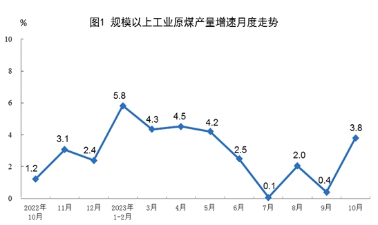 一、原煤、原油和天然氣生產及相關情況 原煤生產增速加快,進口較快增長。10月份,生產原煤3.9億噸,同比增長3.8%,增速比9月份加快3.4個百分點,日均產量1254.0萬噸。進口煤炭3599萬噸,同比增長23.3%,增速比9月份回落4.5個百分點。
