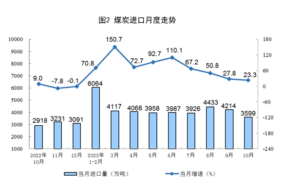 1—10月份,生產原煤38.3億噸,同比增長3.1%。進口煤炭3.8億噸,同比增長66.8%。