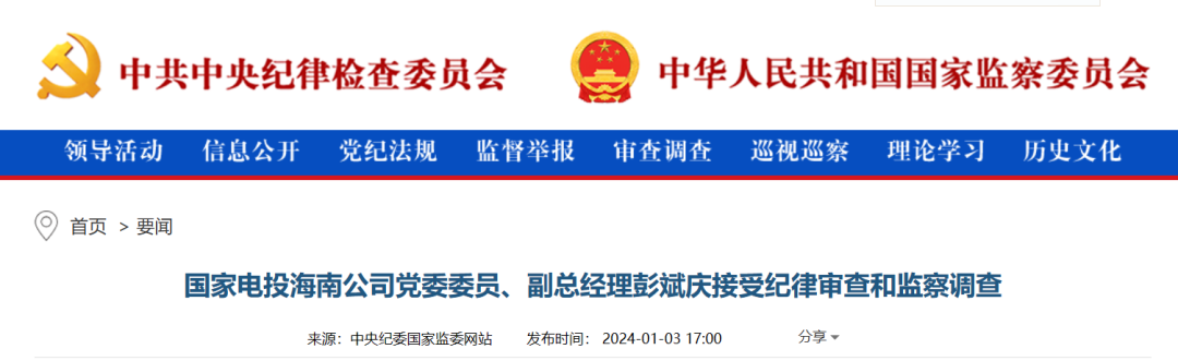 中央紀(jì)委國家監(jiān)委網(wǎng)站1月3日消息,據(jù)國家電投紀(jì)檢監(jiān)察組、海南省紀(jì)委監(jiān)委消息:國家電投海南公司黨委委員、副總經(jīng)理彭斌慶涉嫌嚴(yán)重違紀(jì)違法,目前正接受國家電投紀(jì)檢監(jiān)察組和海南省昌江縣監(jiān)委紀(jì)律審查和監(jiān)察調(diào)查。