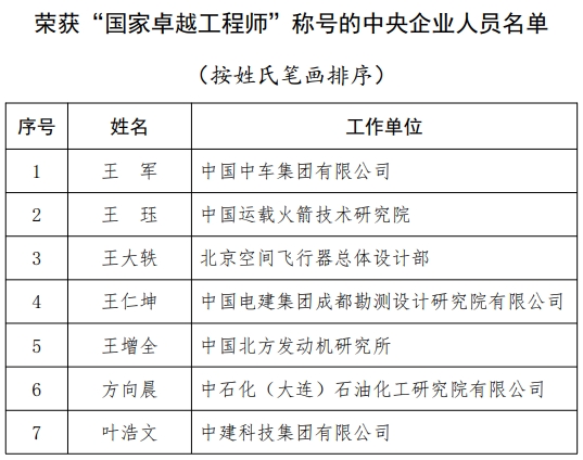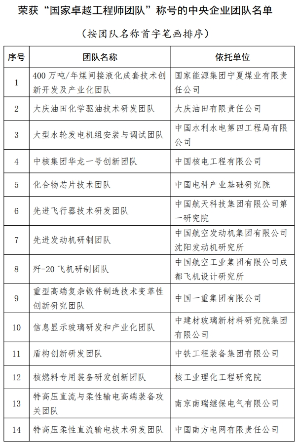 中央企業(yè)共有王軍等29名工程科技人才榮獲“國家卓越工程師”稱號,400萬噸/年煤間接液化成套技術(shù)創(chuàng)新開發(fā)及產(chǎn)業(yè)化團(tuán)隊(duì)等20個團(tuán)隊(duì)榮獲“國家卓越工程師團(tuán)隊(duì)”稱號。