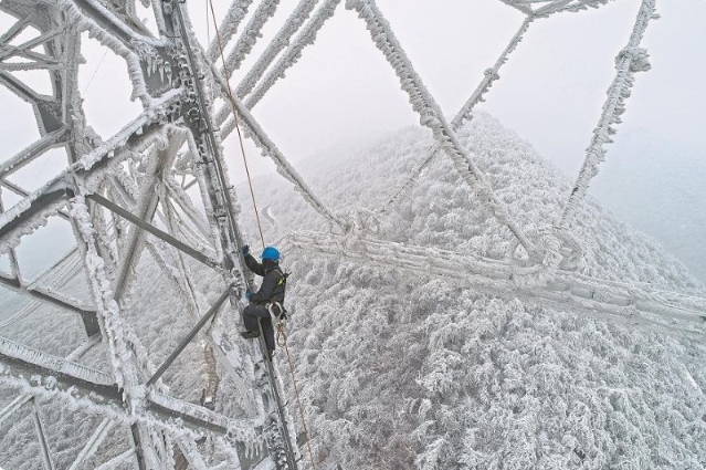 國(guó)網(wǎng)湖北電力員工清除±800千伏陜武特高壓直流輸電線路地線覆冰。