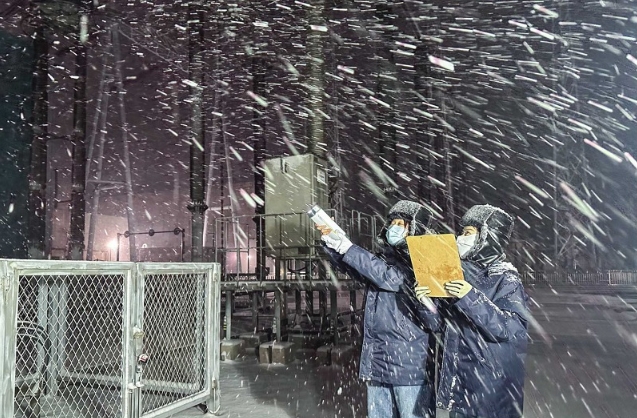國網(wǎng)河南電力員工冒雪特巡±800千伏中州換流站。