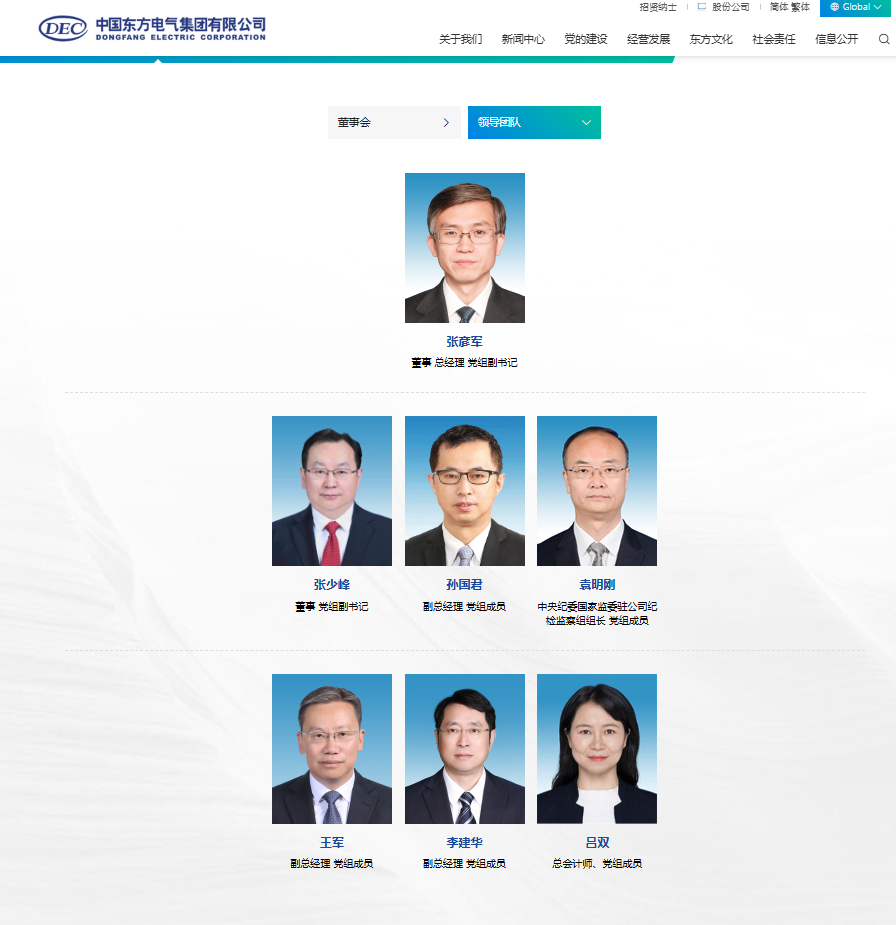 中國東方電氣集團(tuán)有限公司官網(wǎng)領(lǐng)導(dǎo)團(tuán)隊(duì)信息出現(xiàn)變動(dòng),董事長、黨組書記俞培根的相關(guān)信息已被撤下,不在領(lǐng)導(dǎo)團(tuán)隊(duì)之列。目前在該欄目排位第一的,是該公司董事、總經(jīng)理、黨組副書記張彥軍。