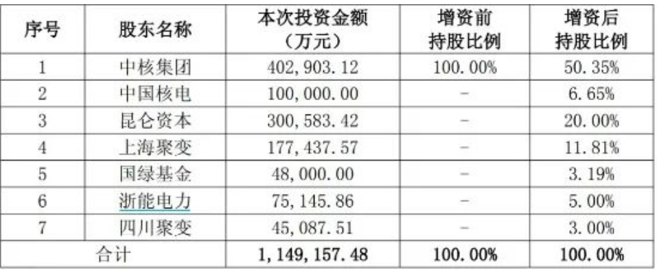 相關(guān)信息顯示中核集團(tuán)、中國核電、浙能電力、中國石油集團(tuán)昆侖資本有限公司、上海未來聚變能源科技有限公司、國家綠色發(fā)展基金股份有限公司及四川重科聚變能源科技有限公司,以1.0019元/注冊資本的價格,共同向中國聚變能源有限公司投資約114.92億元,認(rèn)購聚變公司新增注冊資本114.69億元。其中,中核集團(tuán)本輪出資40.29億元,增資后持有中國聚變公司50.35%股份。中國核電投資金額為10億元,持有聚變公司6.65%股權(quán);浙能電力出資約7.51億元,持有聚變公司5%股權(quán)。此外,中石油旗下昆侖資本此次投資約30.06億元,獲得中國聚變公司20%股份,成為第二大股東,本次增資完成后,聚變公司的注冊資本為150億元,具體股權(quán)結(jié)構(gòu)如下: