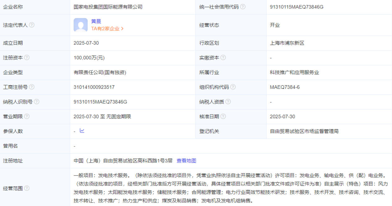 7月30日,國家電投集團國際能源有限公司成立,法定代表人為黃晨,注冊資本100000萬人民幣,由國家電力投資集團有限公司全資持股。
