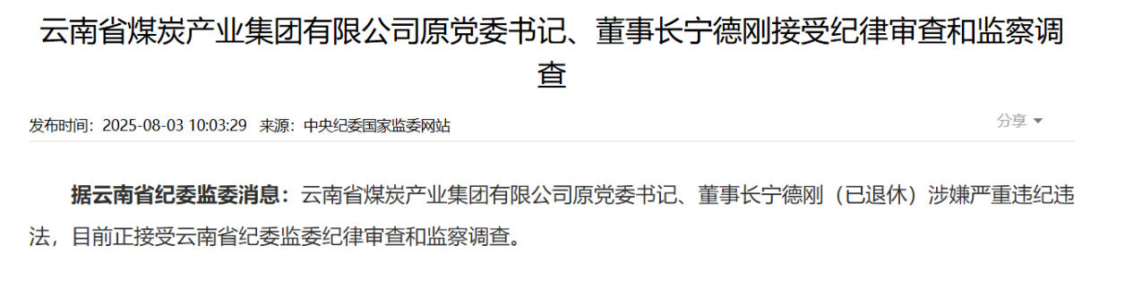 據(jù)云南省紀(jì)委監(jiān)委8月3日消息,云南省煤炭產(chǎn)業(yè)集團有限公司原黨委書記、董事長寧德剛(已退休)涉嫌嚴(yán)重違紀(jì)違法,目前正接受審查調(diào)查。