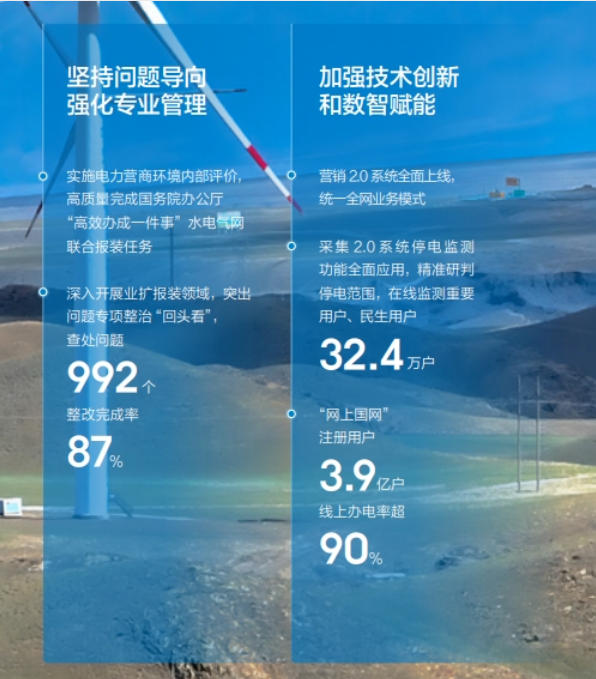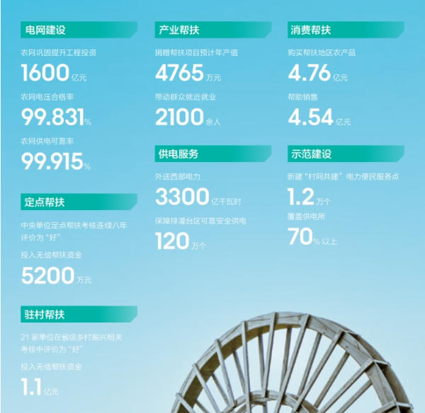 農網鞏固提升工程投資1600億元,農網電壓合格率99.831%,農網供電可靠率99.915%;捐贈幫扶項目預計年產值4765萬元,帶動群眾就近就業(yè)2100余人;投入無償幫扶資金1.1億元。