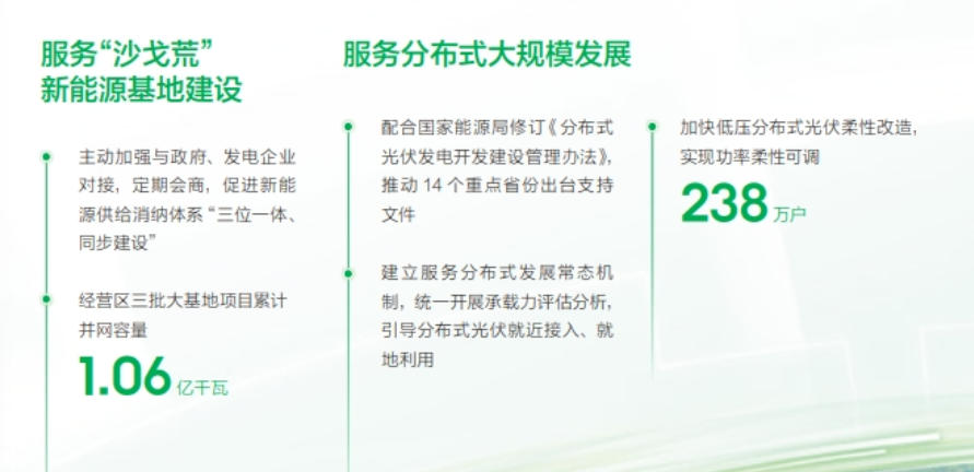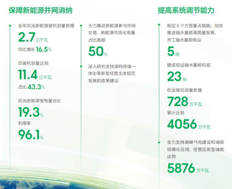 促進新能源高質量發(fā)展,經營區(qū)三批大基地項目累計并網容量1.06億千瓦;加快低壓分布式光伏柔性改造,實現功率柔性可調238萬戶;全年風光新能源裝機容量新增2.7億千瓦,同比增長16.5%;風光新能源發(fā)電量占比19.3%,利用率96.1%;開工抽水蓄能電站5座,建成投運抽水蓄能機組23臺,在運裝機容量累計達到4056萬千瓦;經營區(qū)新型儲能達到5876萬千瓦。