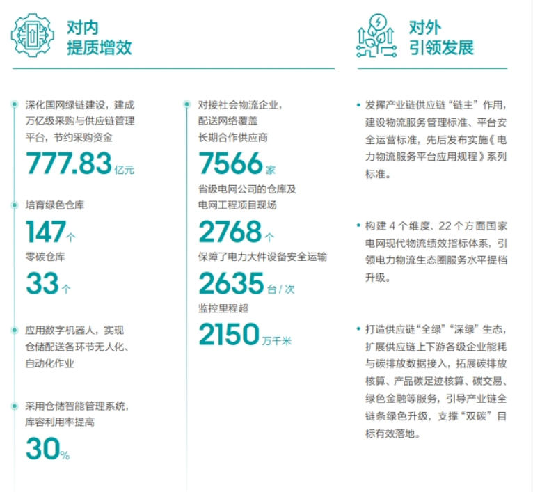打造綠色數智供應鏈,對內深化國網綠鏈建設,建成萬億級采購與供應鏈管理平臺,節(jié)約采購資金777.83億元;對外構建4個維度、22個方面國家電網現代物流績效指標體系,引領電力物流生態(tài)圈服務水平提檔升級。