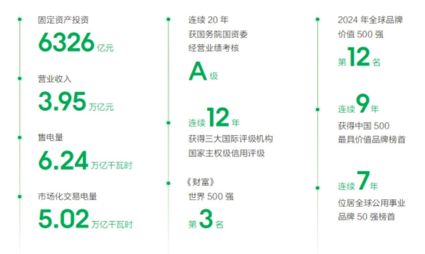 2024年完成固定資產投資6326億元,達成營業(yè)收入3.95萬億元;全年售電量6.24萬億千瓦時,市場化交易電量5.02萬億千瓦時;并網發(fā)電裝機容量26.3億千瓦,其中風光新能源并網裝機容量11.4億千瓦;累計建成特高壓工程“22交16直”38項,跨區(qū)跨省輸電能力3.4億千瓦,建成全球技術水平最高、配置資源能力最強、并網裝機規(guī)模最大、安全運行時間最長的交直流混聯特大型電網。