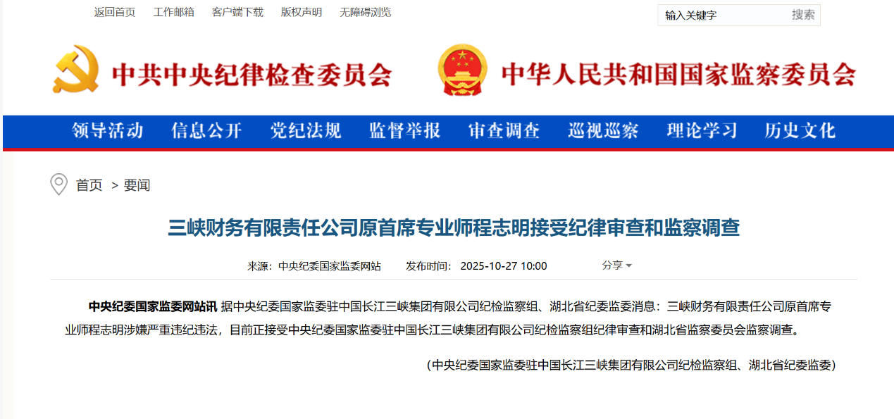 10月27日,中央紀(jì)委國家監(jiān)委網(wǎng)站信息顯示,據(jù)中央紀(jì)委國家監(jiān)委駐中國長江三峽集團(tuán)有限公司紀(jì)檢監(jiān)察組、湖北省紀(jì)委監(jiān)委消息:三峽財(cái)務(wù)有限責(zé)任公司原首席專業(yè)師程志明涉嫌嚴(yán)重違紀(jì)違法,目前正接受中央紀(jì)委國家監(jiān)委駐中國長江三峽集團(tuán)有限公司紀(jì)檢監(jiān)察組紀(jì)律審查和湖北省監(jiān)察委員會(huì)監(jiān)察調(diào)查。