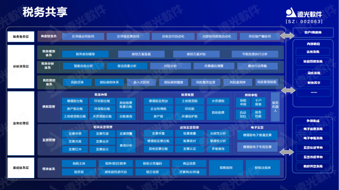 應用先進數(shù)字技術建立稅務標準體系,構建全稅種、全業(yè)務屬性發(fā)票池,并通過搭建稅企直連通道服務建立全稅種智能辦稅平臺,實現(xiàn)全稅種的計稅、報稅、繳稅、歸檔全流程智能化處理。同時,通過引入稅務局的監(jiān)管和審計規(guī)則來構建稅務稽查模型,實現(xiàn)360度的稅務風險掃描,全面助力集團企業(yè)推進稅務管理的標準化、數(shù)字化、共享化、智慧化轉(zhuǎn)型。