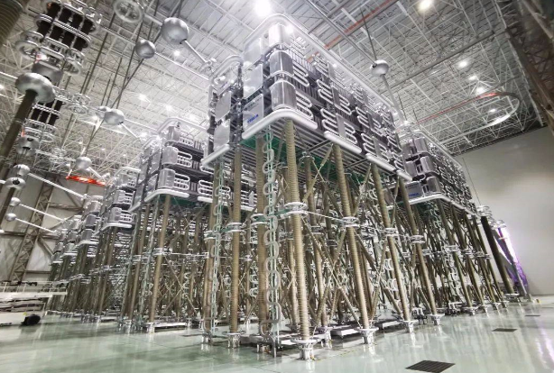柳北換流站作為昆柳龍直流工程的一環(huán),承接了從昆北到龍門的送電任務(wù)。特變電工承擔柳北極1換流站設(shè)備研制與生產(chǎn)任務(wù),設(shè)備總?cè)萘繛?GW,涉及2個閥廳24個閥塔。作為柔性直流輸電技術(shù)的心臟——換流閥,是直流電和交流電相互轉(zhuǎn)換的橋梁,通過換流閥可以實現(xiàn)交流電和直流電的電壓(即:交直流電不同電壓等級之間互聯(lián)互相轉(zhuǎn)換)變換,可以實現(xiàn)送電功率(即:電容量大小)的變送,這在柔性直流主設(shè)備中技術(shù)含量最高、挑戰(zhàn)最大。