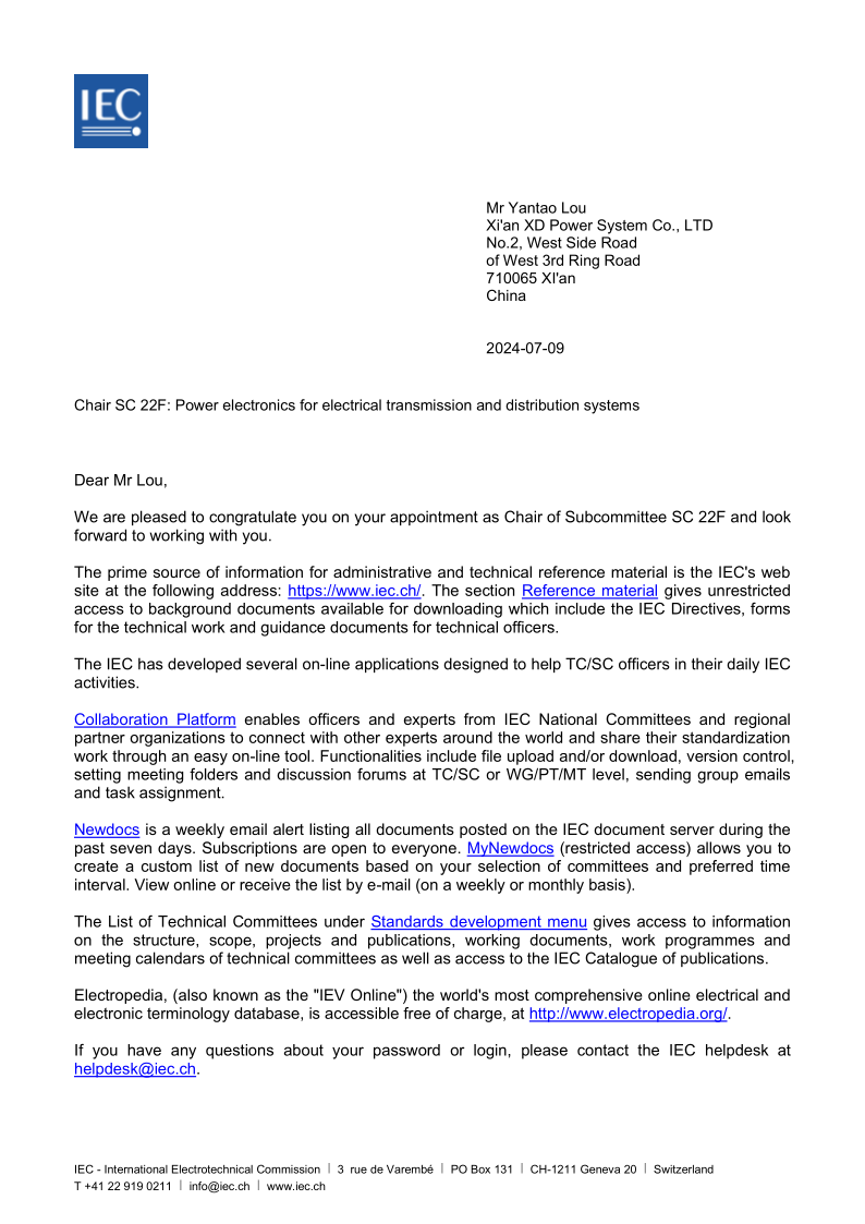 中國(guó)電氣裝備代表當(dāng)選國(guó)際電工委員會(huì)(IEC )TC22 SC22F主席