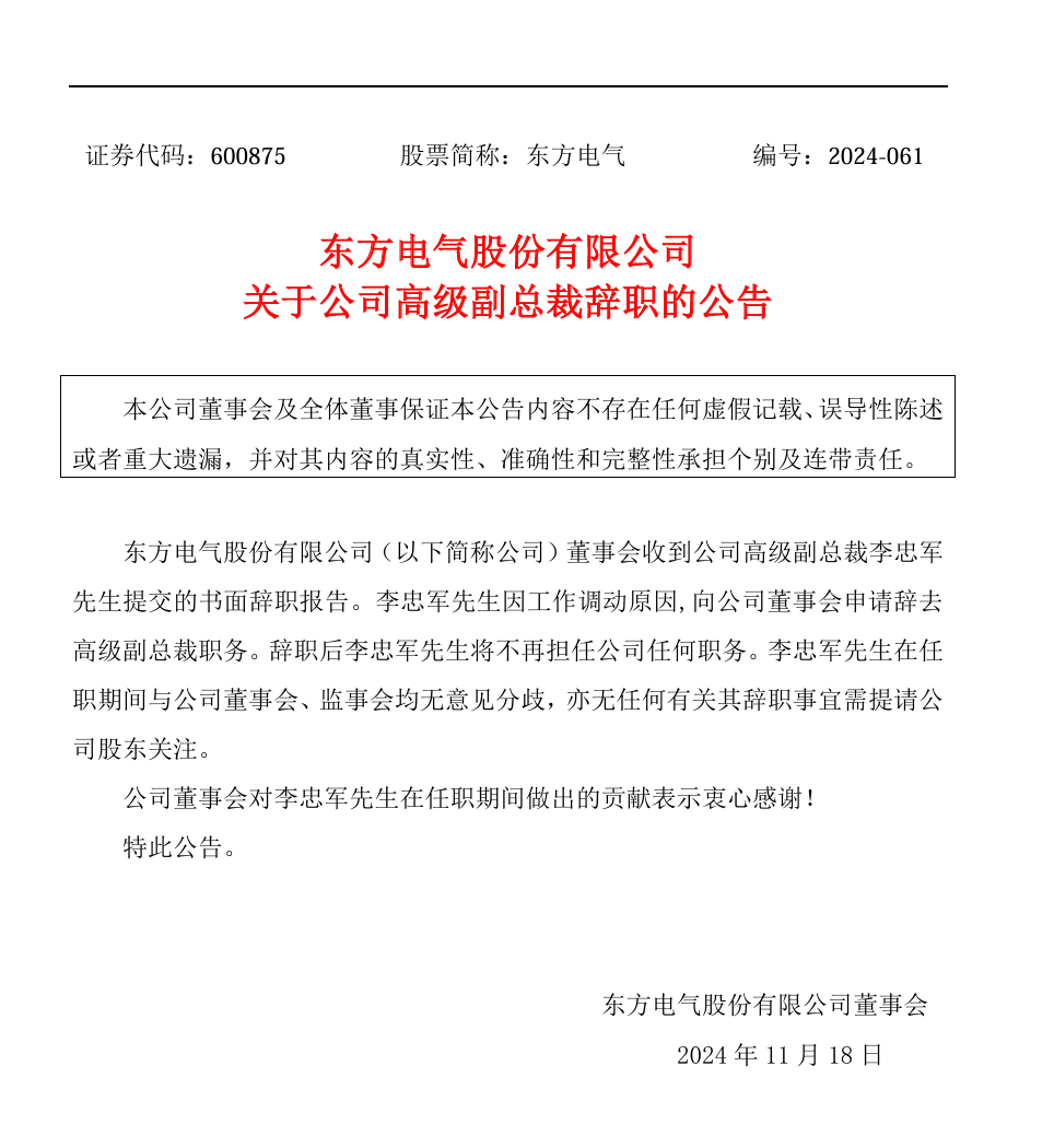 11月18日,東方電氣發(fā)布公告稱,公司董事會收到公司高級副總裁李忠軍先生提交的書面辭職報告。李忠軍先生因工作調(diào)動原因,向公司董事會申請辭去高級副總裁職務(wù)。辭職后李忠軍先生將不再擔(dān)任公司任何職務(wù)。