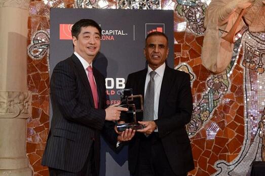 華為輪值CEO胡厚崑(左)接受GSMA主席、印度Bharti公司創(chuàng)始人兼董事長Sunil Bharti Mittal(右)頒獎(jiǎng)