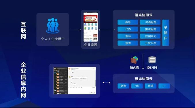 遠(yuǎn)光“企業(yè)家園”采用公有云與私有云共存的混合云架構(gòu),即對于企業(yè)商密等級較低的數(shù)據(jù),如消息提醒、待辦提醒等可以通過移動端在外網(wǎng)進(jìn)行實(shí)時訪問,對于企業(yè)內(nèi)部數(shù)據(jù)、商密等級高的數(shù)據(jù),依然保留在本地,通過企業(yè)電腦端才能訪問。充分利用互聯(lián)網(wǎng)應(yīng)用的靈活性、便利性的同時,保證數(shù)據(jù)的安全性、私密性。