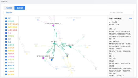 通過(guò)遠(yuǎn)光軟件“知識(shí)圖譜應(yīng)用平臺(tái)”的圖譜構(gòu)建模塊,可以將審單過(guò)程中需要用到的各種實(shí)體融合到一張圖中,非常直觀的定義各類實(shí)體間的關(guān)系。再通過(guò)RPA或外部系統(tǒng)提供的數(shù)據(jù)接口,將實(shí)體所對(duì)應(yīng)的具體數(shù)據(jù)導(dǎo)入,從而形成我們審單所需要的各類知識(shí)。單據(jù)中包含了哪些信息,哪些需要被重點(diǎn)關(guān)注,在圖中一目了然,真正做到了“哪里不清楚點(diǎn)哪里”。最后,將審單規(guī)則配置到圖譜中,就可以實(shí)現(xiàn)報(bào)銷單的自動(dòng)審核。