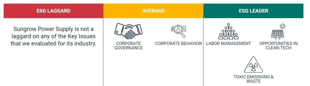 核心ESG議題方面,陽光電源在勞工管理、清潔能源機遇,以及有害排放和廢棄物三個指標(biāo)方面都處于行業(yè)領(lǐng)先位置,沒有議題落后于同業(yè)企業(yè)。