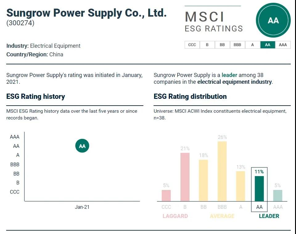 在新增的25只A股中,陽光電源股份有限公司(300274,陽光電源)的MSCI ESG評級為AA級,成為2016年以來第3家獲得高評級(AA或AAA級)的A股公司。