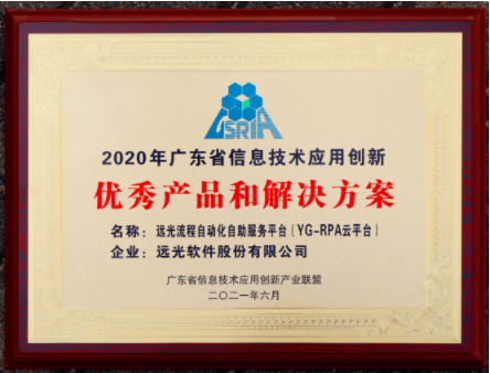 近日,遠(yuǎn)光軟件自主研發(fā)的YG-RPA云平臺(tái)(流程化自動(dòng)自助服務(wù)平臺(tái))憑借其在數(shù)字化領(lǐng)域獨(dú)到的創(chuàng)新成果,榮獲廣東省信息技術(shù)應(yīng)用創(chuàng)新產(chǎn)業(yè)聯(lián)盟頒發(fā)的“2020年廣東省信息技術(shù)應(yīng)用創(chuàng)新優(yōu)秀產(chǎn)品和解決方案”獎(jiǎng)。