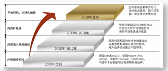 回顧逆變器的發(fā)展歷史,2003年陽光電源推出中國首臺(tái)擁有自主知識(shí)產(chǎn)權(quán)的逆變器。2012年全球出貨量前十中只有陽光電源一家中國企業(yè)。2015年以來,華為、陽光電源和SMA的出貨量前三地位穩(wěn)定,而行業(yè)腰部企業(yè)市場份額接近,競爭更為激烈。在激烈的角逐中,中國逆變器企業(yè)逐漸崛起。如今,陽光電源、華為等品牌逆變器穩(wěn)扎穩(wěn)打,在國際站穩(wěn)腳跟。歷經(jīng)激烈競爭、行業(yè)迭代,我國逆變器企業(yè)實(shí)現(xiàn)從無到有、從有到強(qiáng)的強(qiáng)勢蛻變。