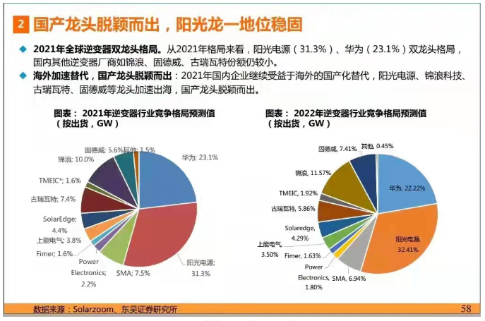 利益驅(qū)使,布局海外市場。國產(chǎn)逆變器在海外的售價(jià)高于國內(nèi),國內(nèi)逆變器企業(yè)加足馬力,將觸角伸向海外市場。2021年國內(nèi)企業(yè)繼續(xù)受益于海外的國產(chǎn)化替代,陽光電源、錦浪科技、古瑞瓦特、固德威等龍頭加速出海,國產(chǎn)龍頭脫穎而出。