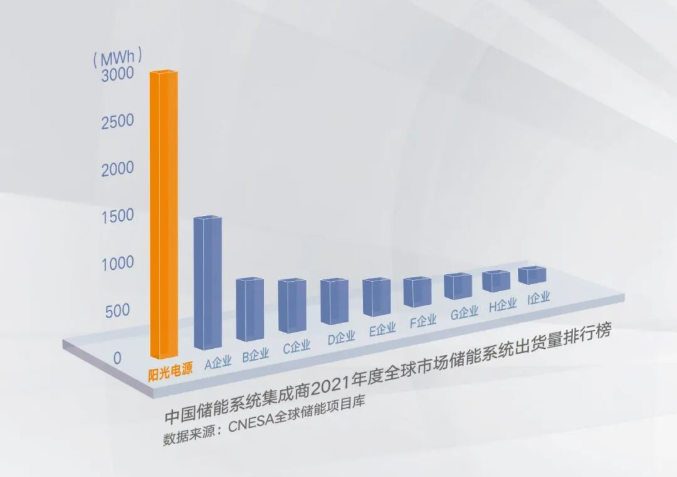 本次排名以全球儲能項(xiàng)目庫為依據(jù),對中國主流儲能系統(tǒng)供應(yīng)商發(fā)貨量進(jìn)行研究,陽光電源憑借2021年儲能系統(tǒng)全球發(fā)貨3GWh、儲能變流器全球發(fā)貨2.5GW,再次贏得雙項(xiàng)第一。