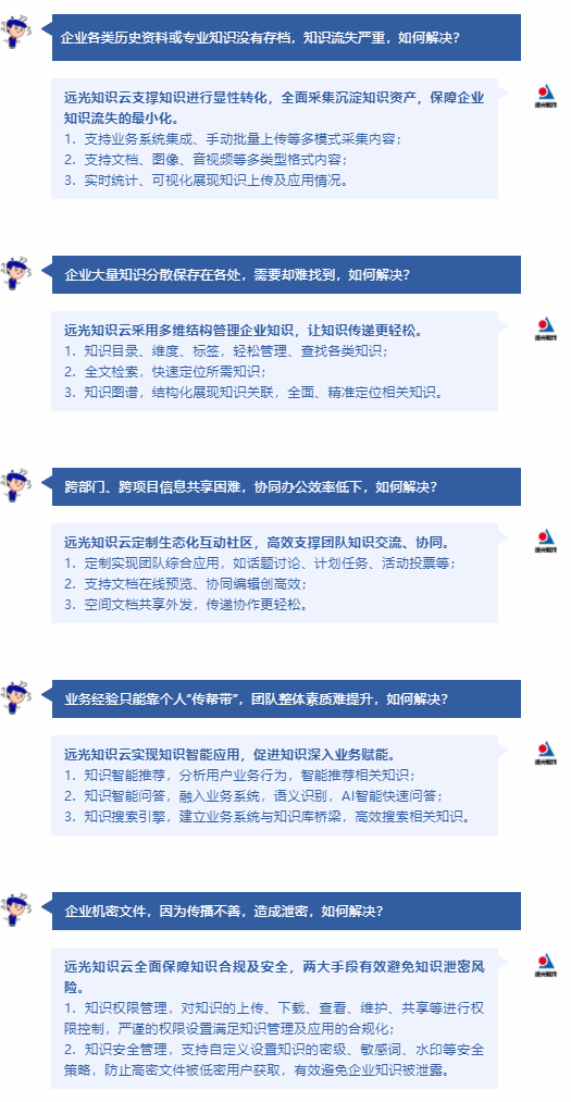 對于企業(yè)知識管理場景中常見的難題,遠光知識云提供以下解決方案,全面支撐企業(yè)知識高效、安全管理與應(yīng)用。